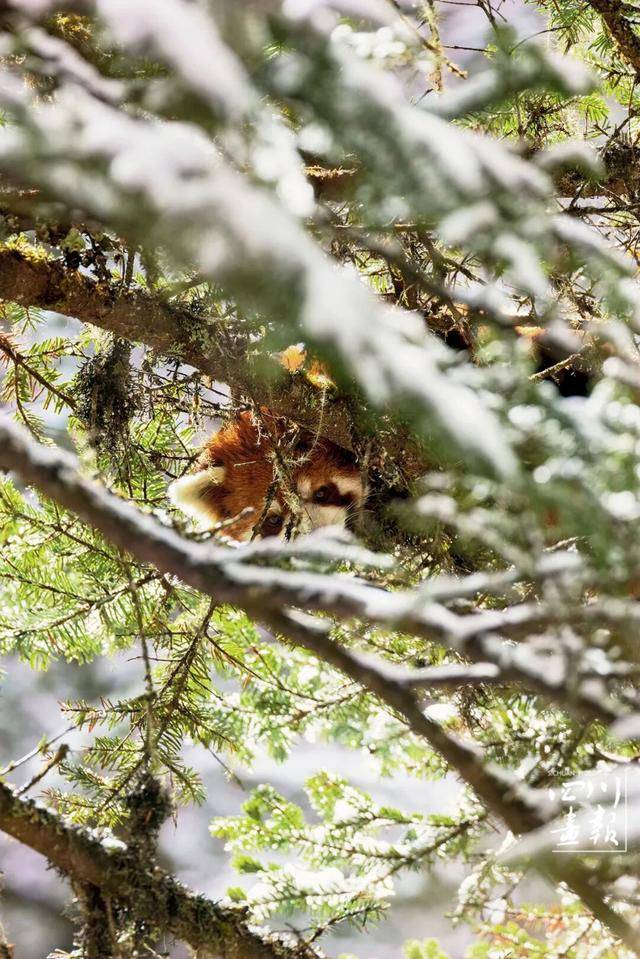 春寒料峭时节,卧龙的小熊猫在树上采食松萝,而像林红强一样的人一直在默默守护它们的安宁生活(何晓安 摄)
