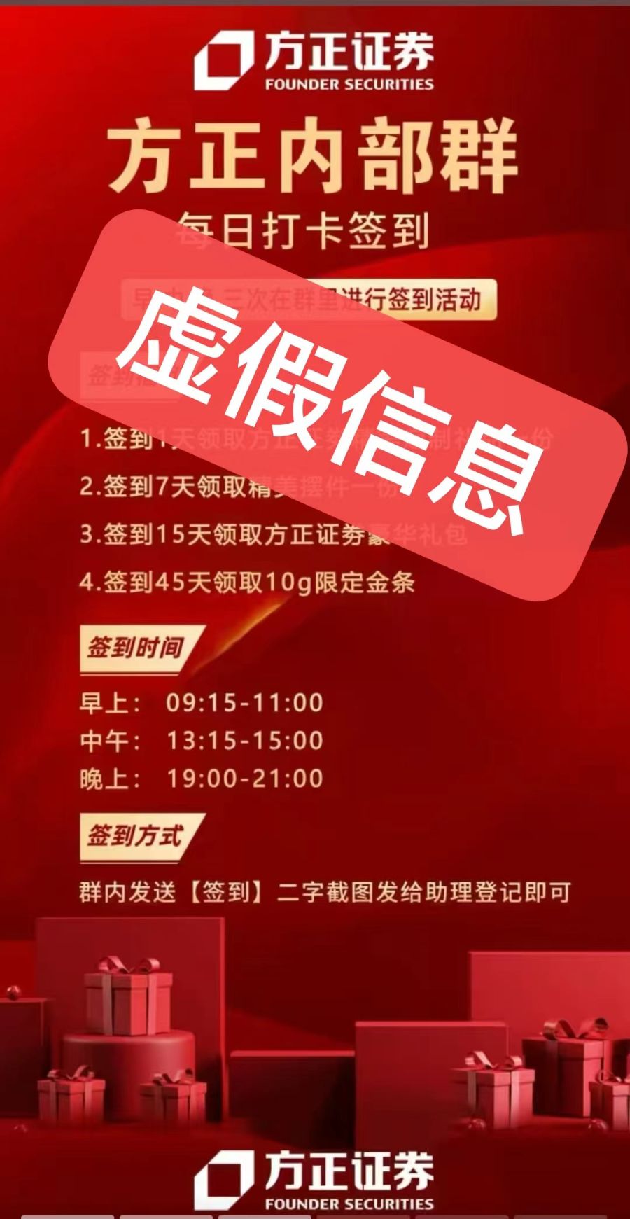 对此,《21辟谣》记者致电方正证券核实。接线工作人员明确表示,公司从未推出此类活动,证券投资存在固有风险,无法保证收益。所谓“内部群签到领取金条”“涨停板筹码分配”均为不法分子设下的骗局,提醒投资者谨防受骗。