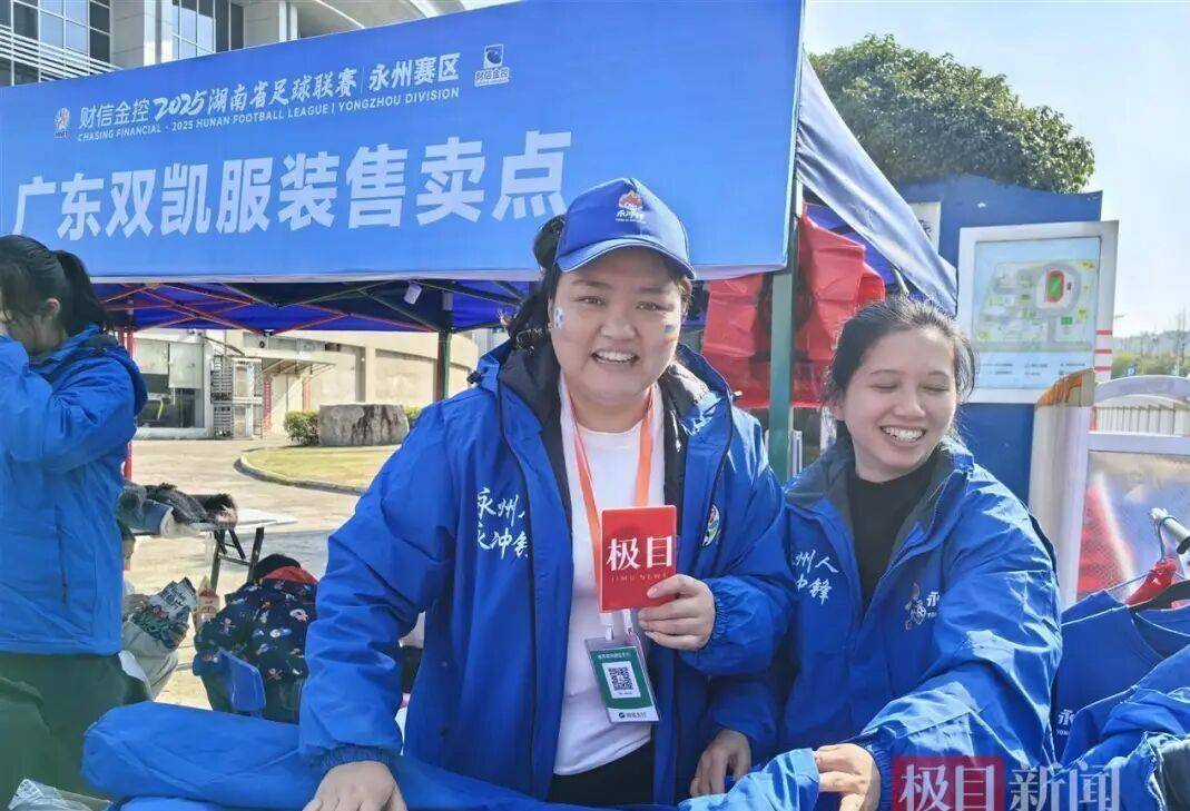 当天下午1点,永州体育场外的集市已人声鼎沸。 所有帐篷清一色是“永州蓝”,那是永州队主场球衣的颜色。 摊位上,“永冲锋”“永州人”字样的冲锋衣挂得满满当当。 一位女老板边收钱边介绍,衣服价格从80多元到190多元不等,卖得最好的是百元左右的款式。