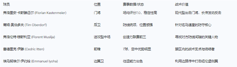 杜塞多夫的进攻高度依赖于塞德里克·伊滕的发挥。这位高中锋本赛季场均射正1.2次,是球队最稳定的得分点 。在他身后,穆斯利亚和阿佩尔坎普(Appelkamp)的组合提供了极佳的层次感 。