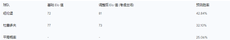 在 Elo 模型中,球队的等级分受对手强度、比赛地点和近期战绩影响。杜塞多夫在纯实力评级(Elo值)上略高于纽伦堡(77对72),但在考虑了德乙联赛显著的主场优势系数(Home Advantage Factor)后,天平发生了偏移 。