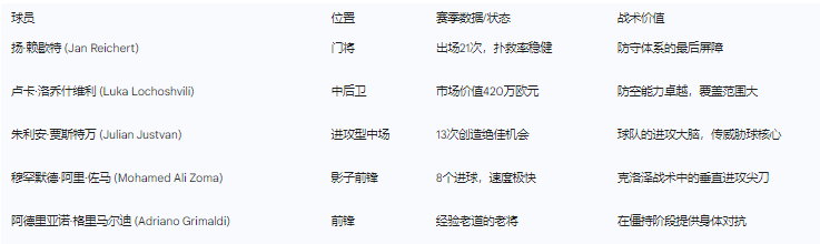 纽伦堡在本场比赛中迎来了一个重大利好:亚当·马基耶夫(Adam Markhiev)和拉斐尔·卢巴赫(Rafael Lubach)在结束禁赛后双双重返首发名单 。马基耶夫作为球队的防守屏障,其本赛季累积了9张黄牌,但也贡献了极高的抢断成功率,他的回归将极大地释放贾斯特万在进攻端的压力