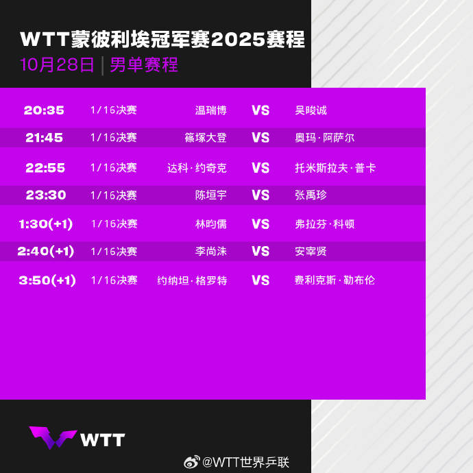 2025-10-28金年会,金年会体育,金年会体育app,金年会体育官方网站,金年会注册,金年会最新入口,金年会APP北京时间10月28日消息,2025年WTT蒙彼利埃冠军赛将于今天开赛,CCTV5全程直播。首个比赛日,中国队共有陈幸同陈垣宇温瑞博三人出战。其中,本次比赛排名最高的中国选手陈幸同迎战罗马尼亚选手斯佐科斯、温瑞博对阵韩国小将吴晙诚、陈垣宇迎战韩国名将张禹珍。